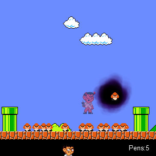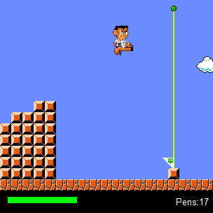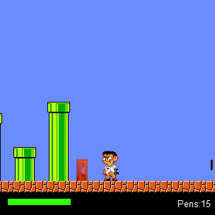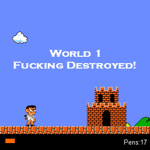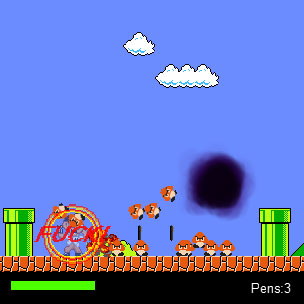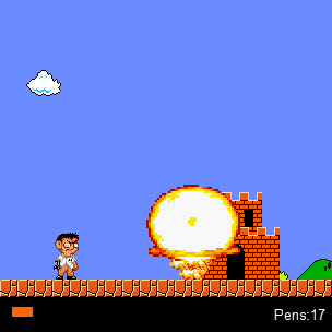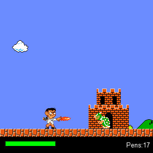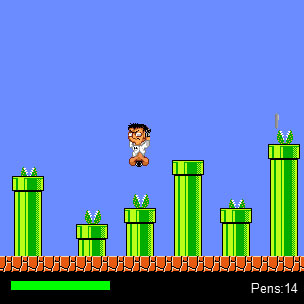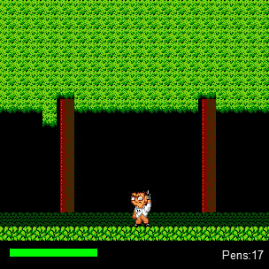 First, a power-up run down: You got the Pens, which are basically like coins in Mario; get 100, you get another life. Next is the (Who couldn't have guessed this) Rolling Rock Beer Bottle, which heals you around 30 HP (That'll change if people find this game too hard. Max HP is 100 by the way). Next is the Nintendo Power Magazine, which make you invincible for a fairly long time, but is limited throughout the game. Next, the AVGN logo, which give you another life. These are normally in 'hard-to-reach' places, but are quite valuable and rare. Finally, (and best of all) the Cinemassacre Chainsaw Logo, in which you use like the hammer in Smash Brothers, only everyone explodes in a graphic display of blood! (James Rolfe, I know you'd enjoy that!)